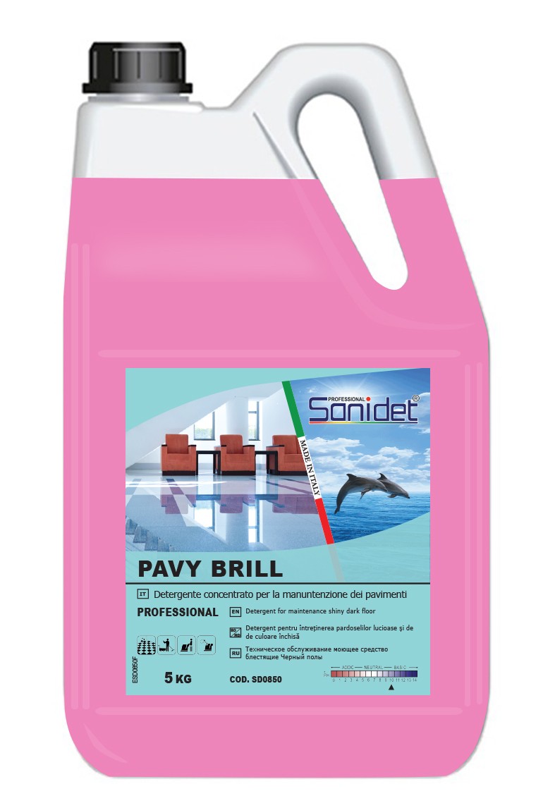 Detergent concentrat pentru spălarea pardoselilor, eficient împotriva oricărui tip de murdărie. Lasă suprafeţele curate şi plăcut parfumate fără a lasa urme şi de aceea nu necesită clătire. Datorită formulei sale Pavy Brill este un produs ideal pentru spălarea zilnică a pardoselilor de orice tip în orice domeniu de activitate. Se poate utiliza cu maşina de spălat / uscat pardoseli, dar în acest caz aveţi nevoie de un adaos mic de produs antispumă Sanidet.